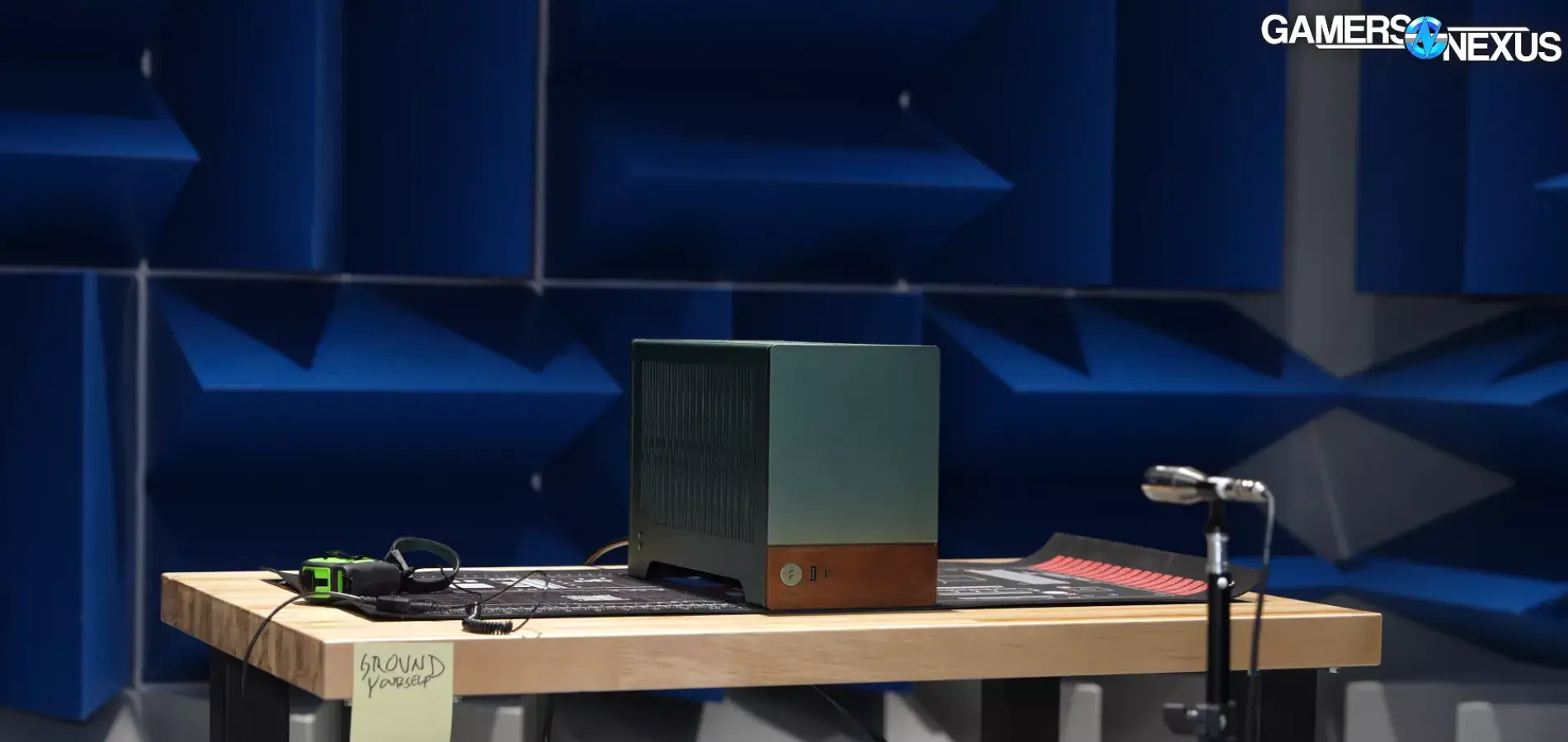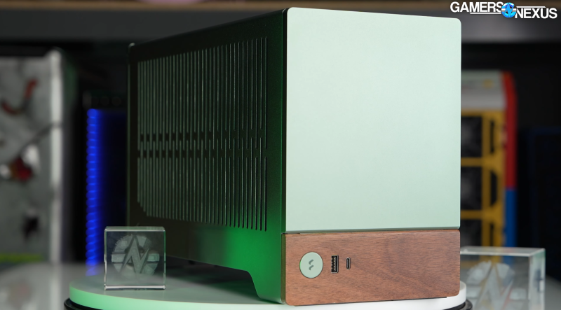 Today, we're reviewing the Fractal Terra mini-ITX case. It has some extremely unique features, but also some extremely unique noise characteristics as a result of the slat design on the panels. In the video, you'll notice that when we replace the side panel with something perforated hexagonally or circularly, the noise profile of the case is significantly better -- it’s not only quieter, but of a more tolerable frequency. We’ll show numbers for that in our noise chamber later. All the audio comparisons will be in the video.