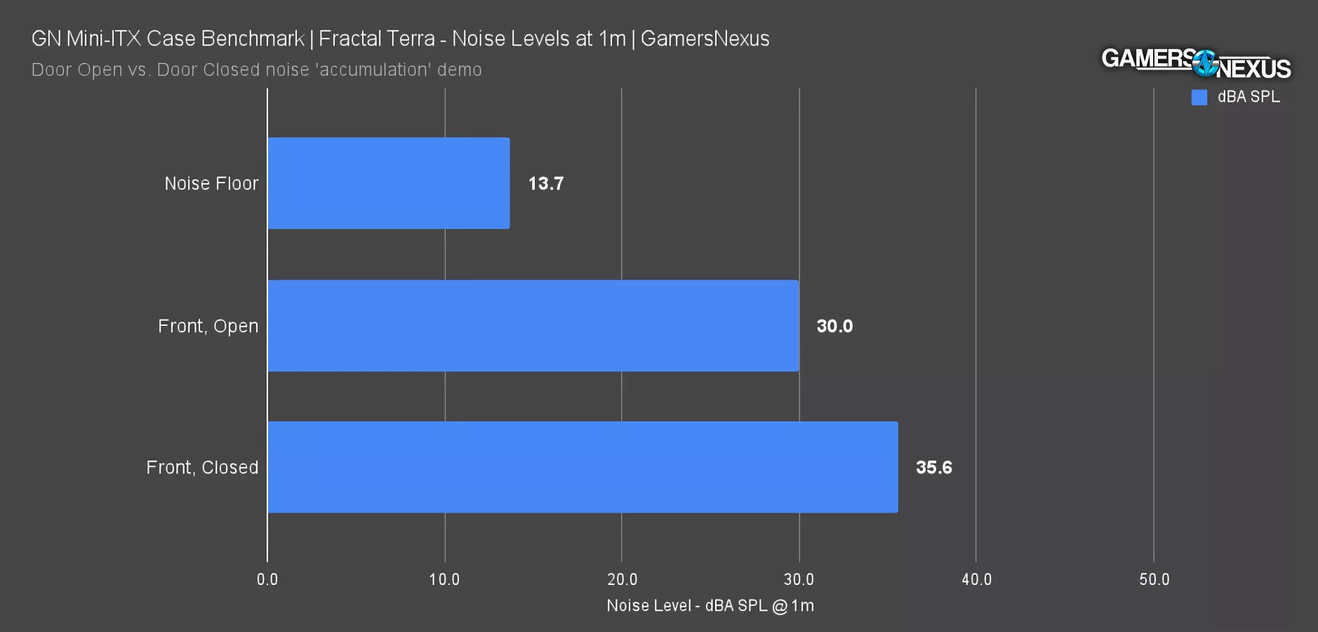 This last charge just shows the total noise levels. The absolute number doesn’t matter much here -- remember that you can control your fans to affect the noise, and this case has no fans, so all we’re really testing is how the cooler fans interact with the case panels. The noise level is significantly lower -- about 5.6dBA reduced -- with the panels open. That’s despite exposing the fans more directly to the outside of the case, so this just proves the slats conflict.