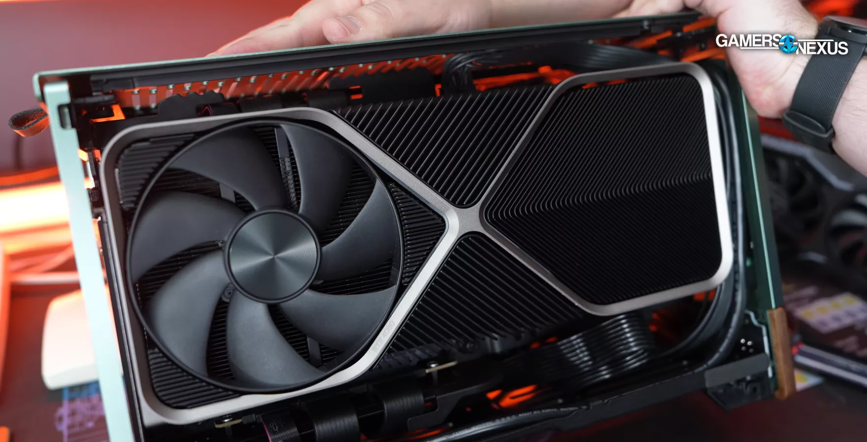 We test fit a few other GPUs to see what fit issues may come up. The reference RX 7900 XTX fit with the spine in position 3 without issues. The tallest card we had on hand was this ASUS Strix Vega 64 at 139mm, and it fit with the spine in position 3 as well, but uses nearly all of the vertical space. The RTX 4080 FE required biasing the spine farther towards the CPU side, reducing the cooler clearance significantly. GPU power cable management can be tricky on the taller cards, and the Corsair SF1000L’s stock 12VHPWR cable is so stiff that we weren’t comfortable forcing it to bend enough to fit. If you’re interested in using a GPU this tall, you’ll need a more flexible individually-sleeved cable or some kind of 90 degree adapter.