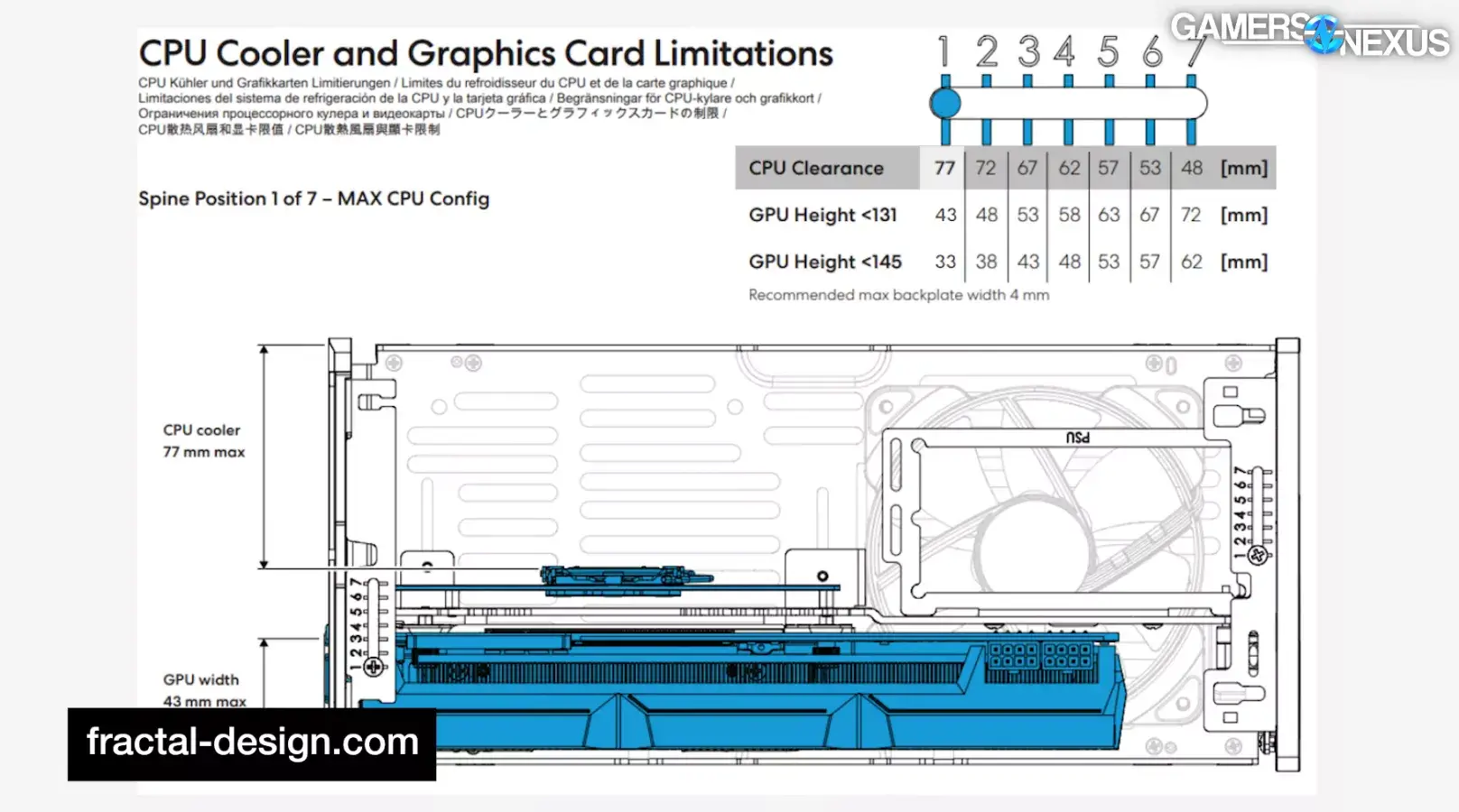 That would have the GPU clearance at 43mm depth, which would fit a 2.0-slot card with about 1-3mm of clearance, depending on tolerances. The maximum GPU cooler space is 72mm, which would have the CPU clearance at a heavily reduced 48mm. A 4090 FE is about 61mm wide - but it wouldn’t clear vertically. More on that later.