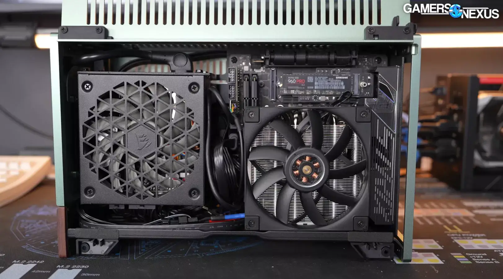 At 77mm of CPU cooler clearance, coolers like the Noctua NH-L9x65 would fit at 65mm or the DeepCool AN600 at 67mm (which is what we used). The 37mm tall Noctua LH-L9i would fit in the 48mm clearance configuration. There are other options too, including from SilverStone, but you’re going to be extremely constrained on CPU choice if fully biasing to accommodate the GPU. It’d be an imbalanced build.