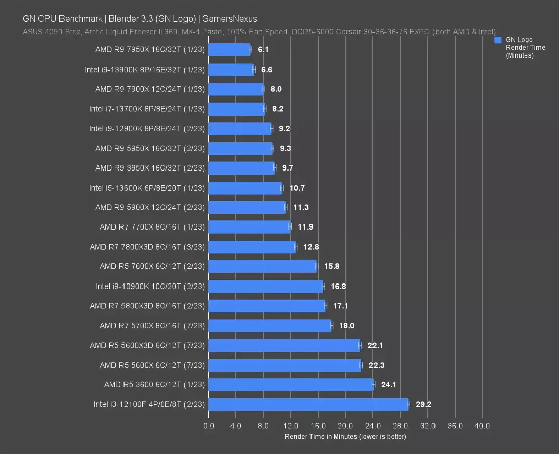 The 7600X posts a large 29% time reduction in this one. Despite being the same core count, the architectural and frequency improvements benefit it in a big way. If you do more of a mix of core-intensive workstation use with your gaming, that’d be where the newer same core-count CPUs would do better. The Intel 13600K also posts a large advantage, landing at just 11 minutes to render.