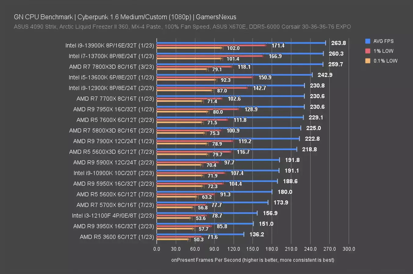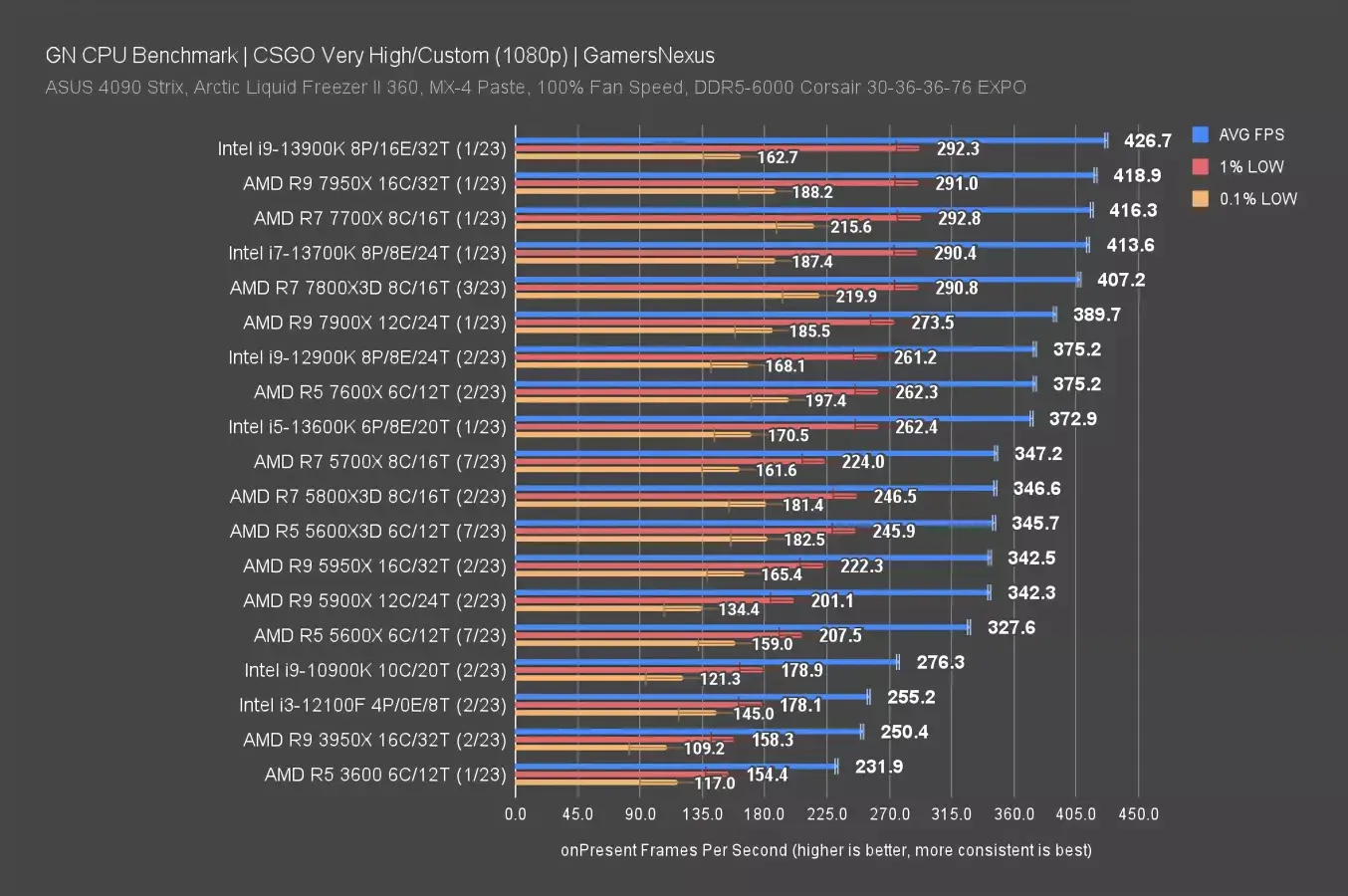 The 5600X3D’s 301FPS AVG pushed it into the company of Intel’s much more expensive 13900K and AMD’s own -- and more expensive 7700X at $300. The 5800X3D is 10% ahead of the 5600X3D, with only the modern 7800X3D (a $440 part now) ahead of that.