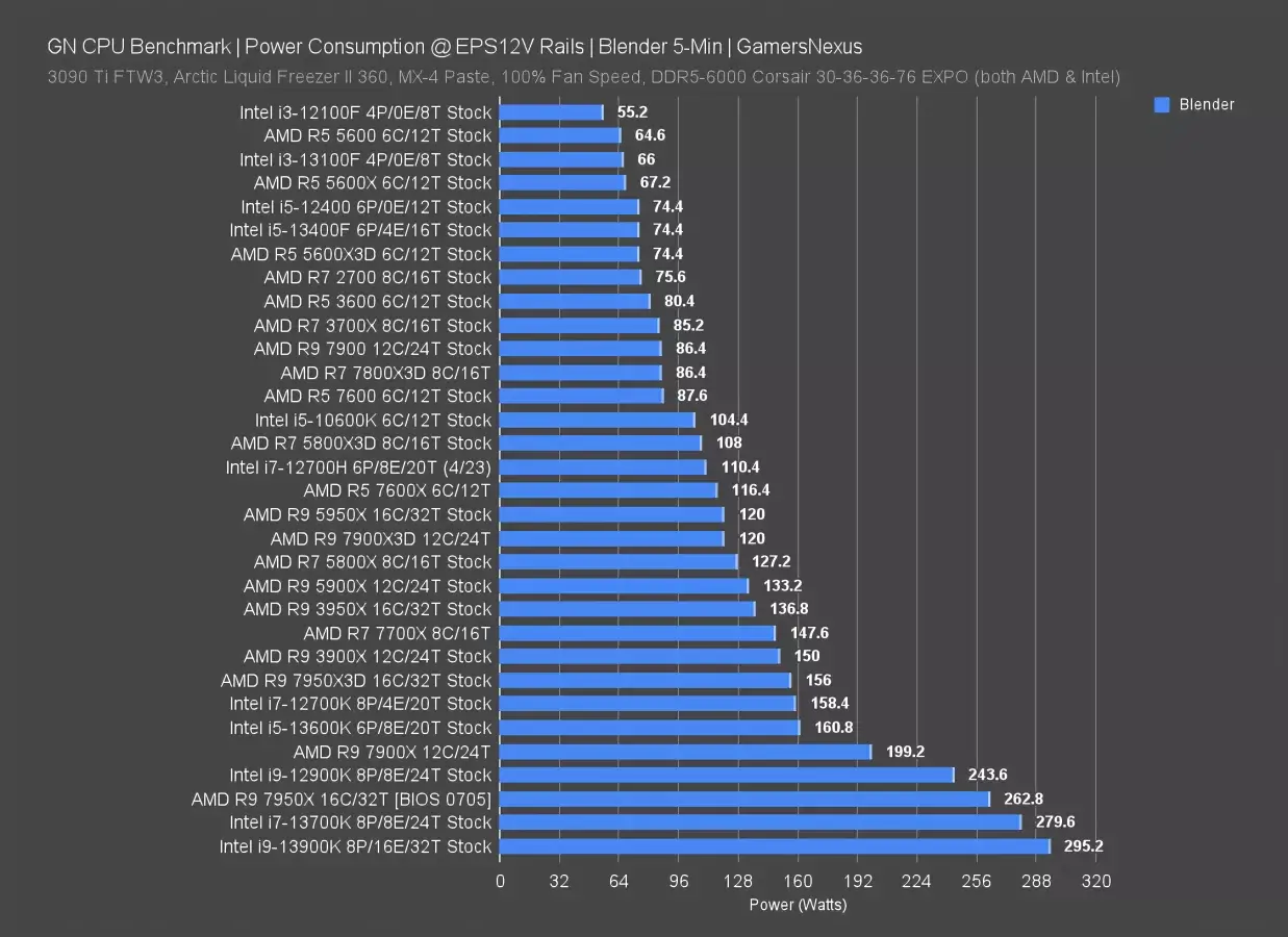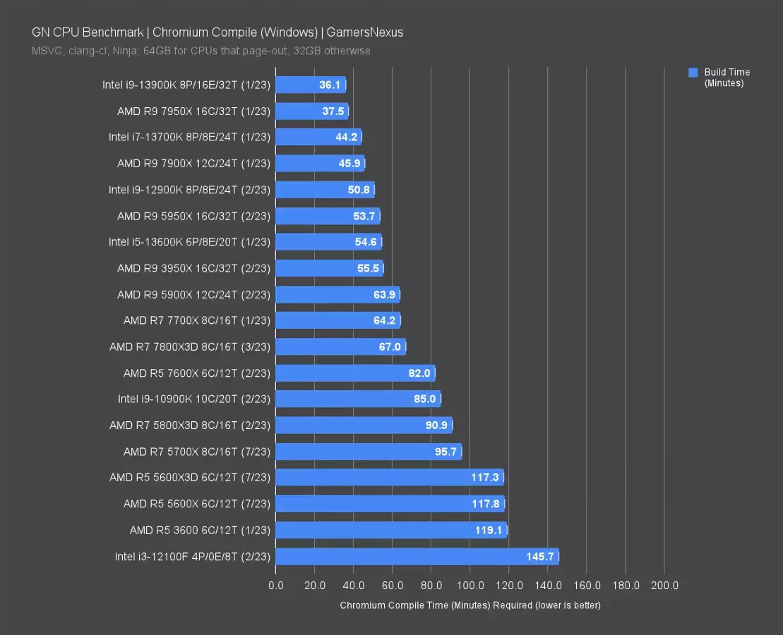 The 5700X ended up a better value here, posting a 96-minute result from its core count increase. Intel’s 13600K halves the time required by pulling a 55-minute result. The X3D still does fine here, it’s just not the reason you’d buy it.