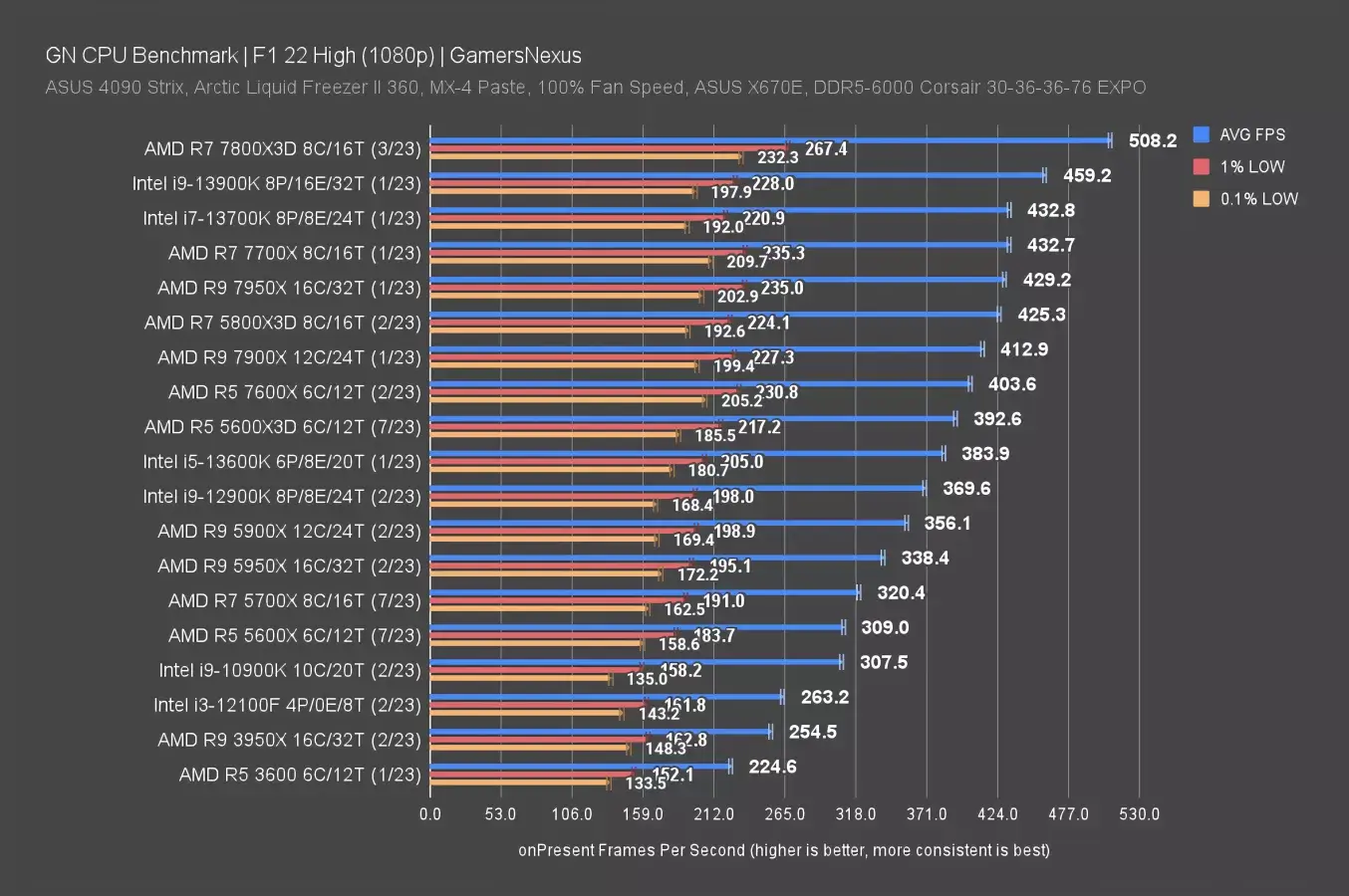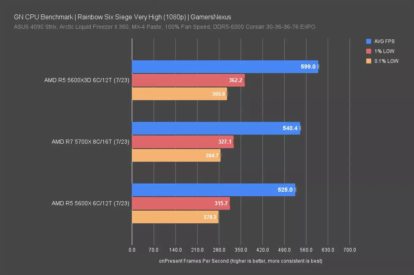 The 5600X3D held about 600FPS AVG. For reference, in the pre-patch tests, the 13900K was over 800FPS -- there’s plenty of room for scale left here. That means the 5600X3D gained about 14% over the 5600X in average framerate performance, with lows also boosted. The lead over the 5700X is only 11% in this one.
