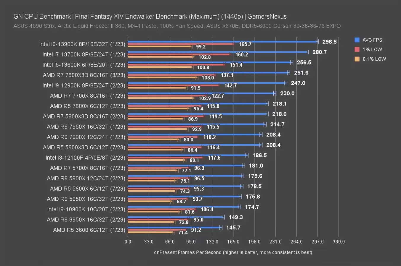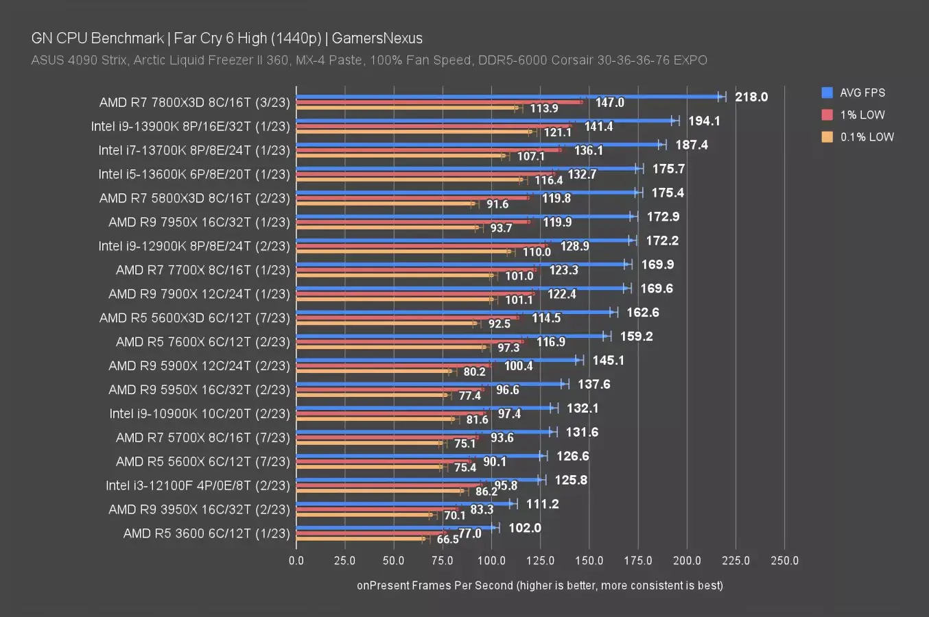 Like with Far Cry 6, there’s no change to the middle of the stack at 1440p. Actually, there’s basically no change other than some small movement: Even the 13900K remains about equal in performance. We’re fully CPU-bound.