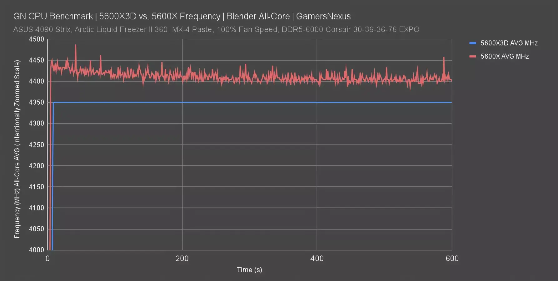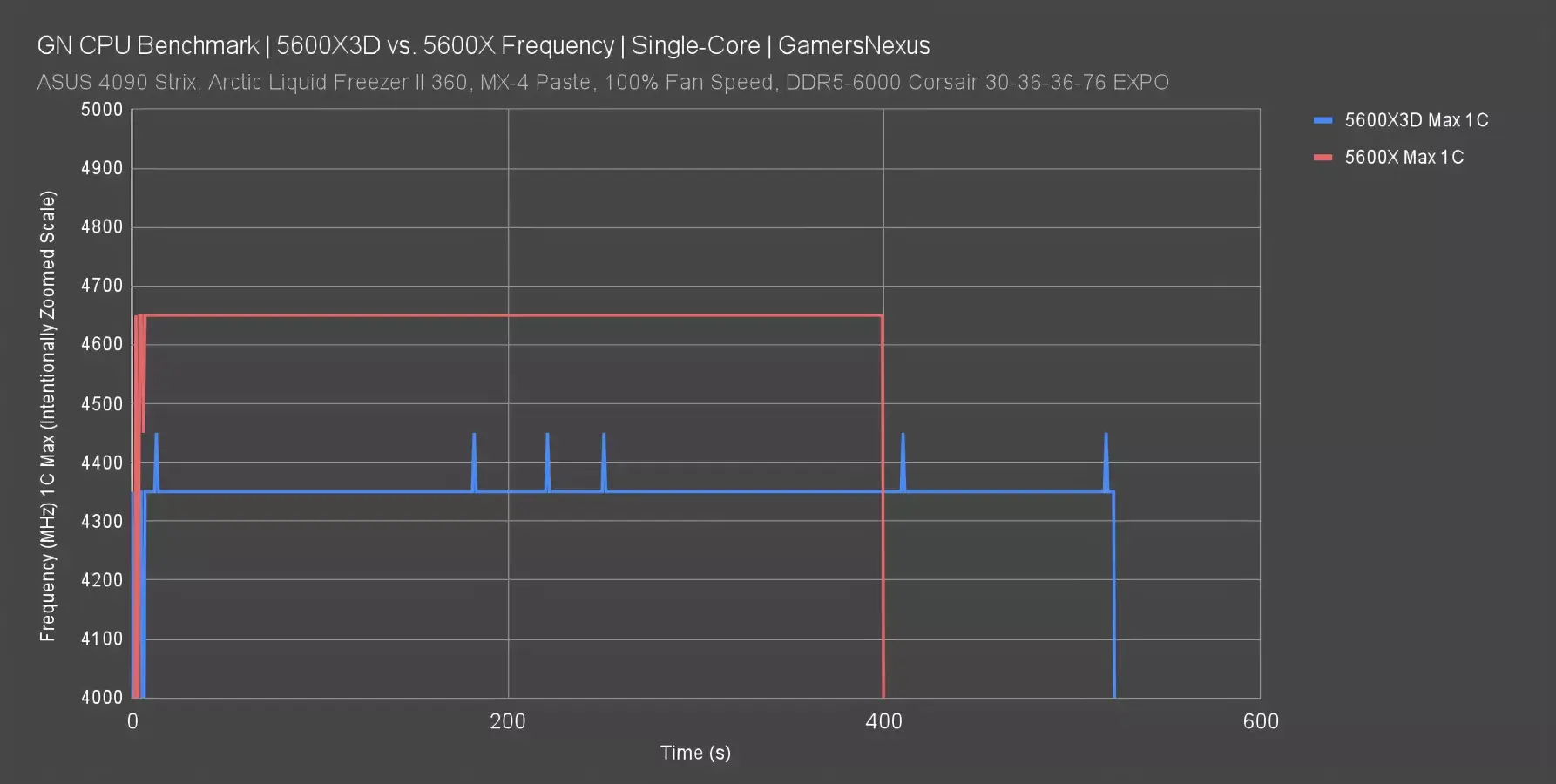 In this one, the 5600X3D was still below the advertised 4.4GHz speeds. AMD isn’t hitting what it’s marketing. Being off by 50MHz is a pretty big gap. Now, technically, there are a few blips to 4400MHz or just past, but 6 plotted seconds of 500 doesn’t really qualify for hitting that marketing, in our opinion.