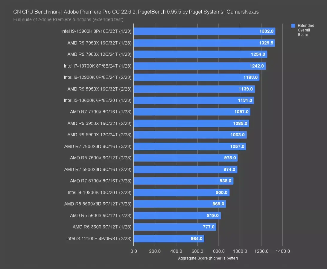 In Adobe Premiere, testing live playback, renders, filters, and other features, the 5600X3D scored 869 points in aggregate. That has it ahead of the 5600X by 50 points, or 6%. That’s a real lead -- it’s just not much of one or particularly worth it for the money. The 5700X manages an 8% lead over the 5600X3D while being cheaper, making it better value between only AMD options. Intel’s 13600K remains a competent performer -- as do the 13500 and 13400, although we haven’t rerun them recently -- and lands in the top half of the chart.