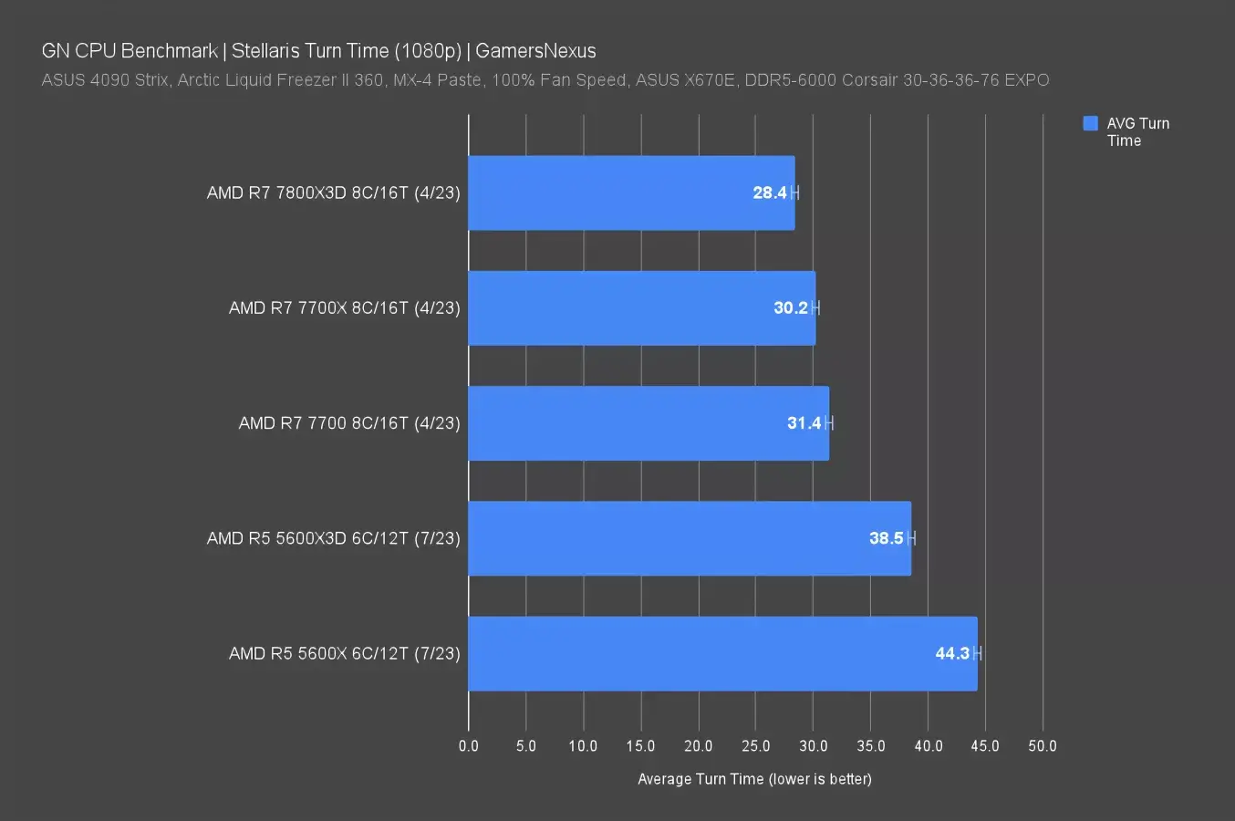 Up next is Stellaris. This was added by popular demand among our audience. We won’t be fully detailing the methodology today -- that’ll be our next major refresh of the test setup -- but the basics are that we’re averaging the turn time over multiple test passes. That’s as opposed to FPS. This is also new, so we only have 5 parts on this one -- all are AMD. We’ll add Intel to the next bench refresh.