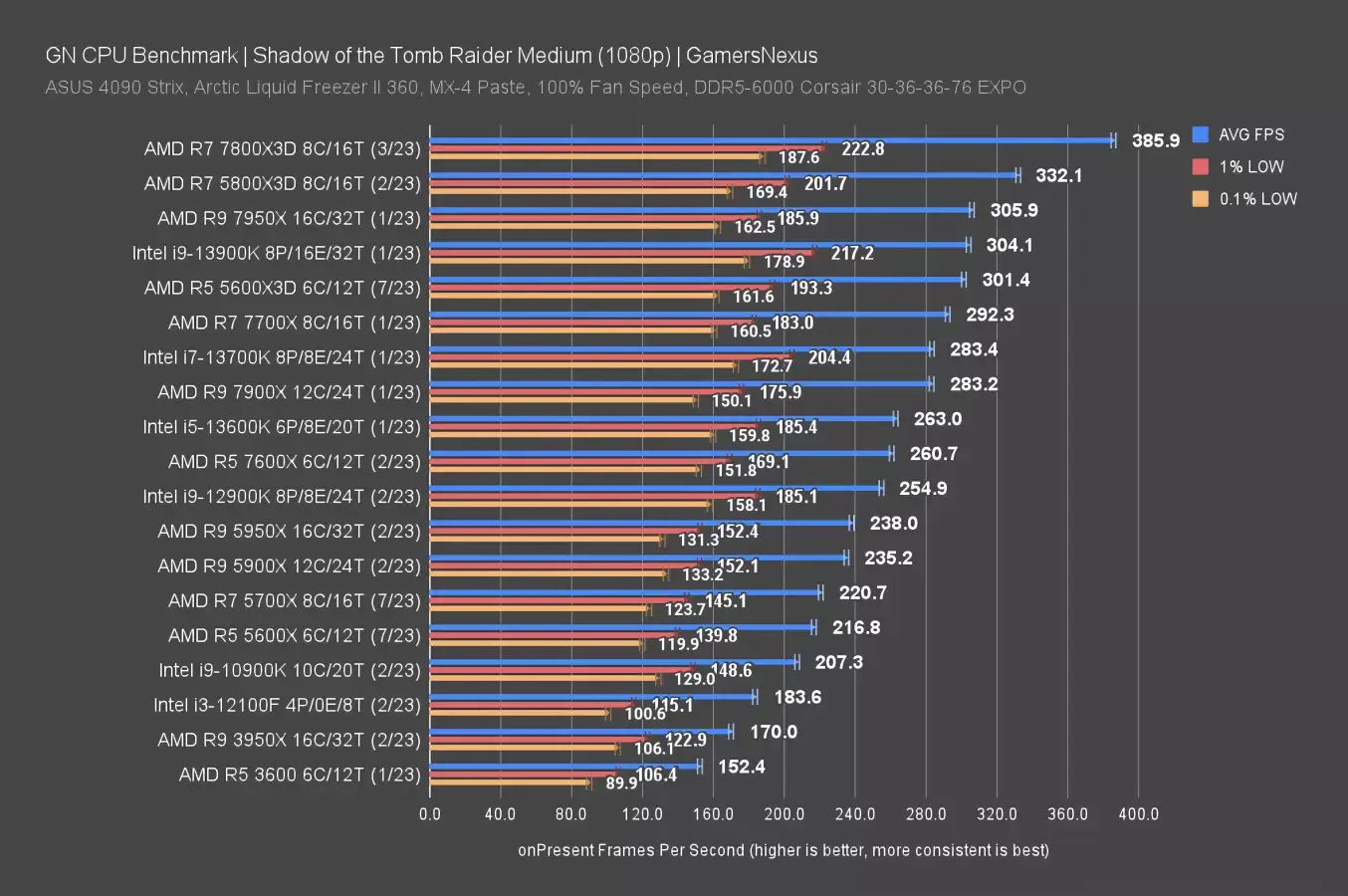 We’re going to start with the two games where we saw the most uplift in previous X3D tests. Tomb Raider is up first, another game where we’ve seen massive uplift from 3D V-Cache CPUs.