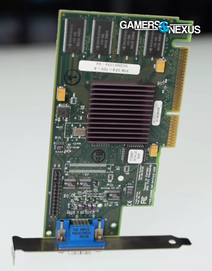 For comparison, we're testing a couple of roughly contemporary AGP cards sent to us by viewers: the 1998 Real3D i740 Starfighter (one of the cards that 3dfx helped to kill) and the 2000 NVIDIA GeForce 2 GTS (one of the cards that helped to kill 3dfx).