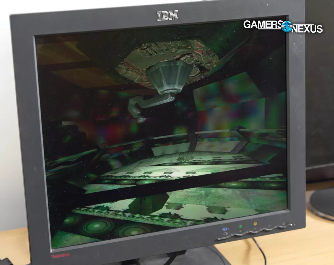 We had to switch to Kramden's old Pentium III system to get the i740 to work properly, and even then it couldn't handle rendering the 2D 1280x1024 desktop at 32bpp. Our Starfighter is the 8MB model with no slot for extra memory, which was a feature on some variants. Quake III refused to even launch with the i740 installed.