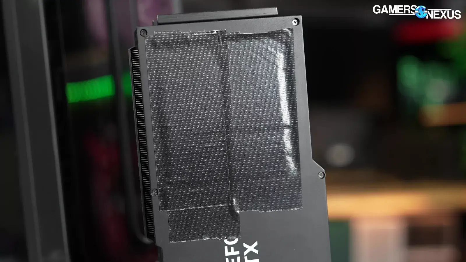 Purely as a curiosity, we decided to cover up the flow-through area of the card. This is something we’ve been wondering about, so it’s just an academic exercise -- there’s no practical value. We used 2 layers of heavy-duty gorilla tape to cover the hole in the backplate. We also controlled the fan speed and the power target, so all variables were fixed except for the presence of the flow-through hole.