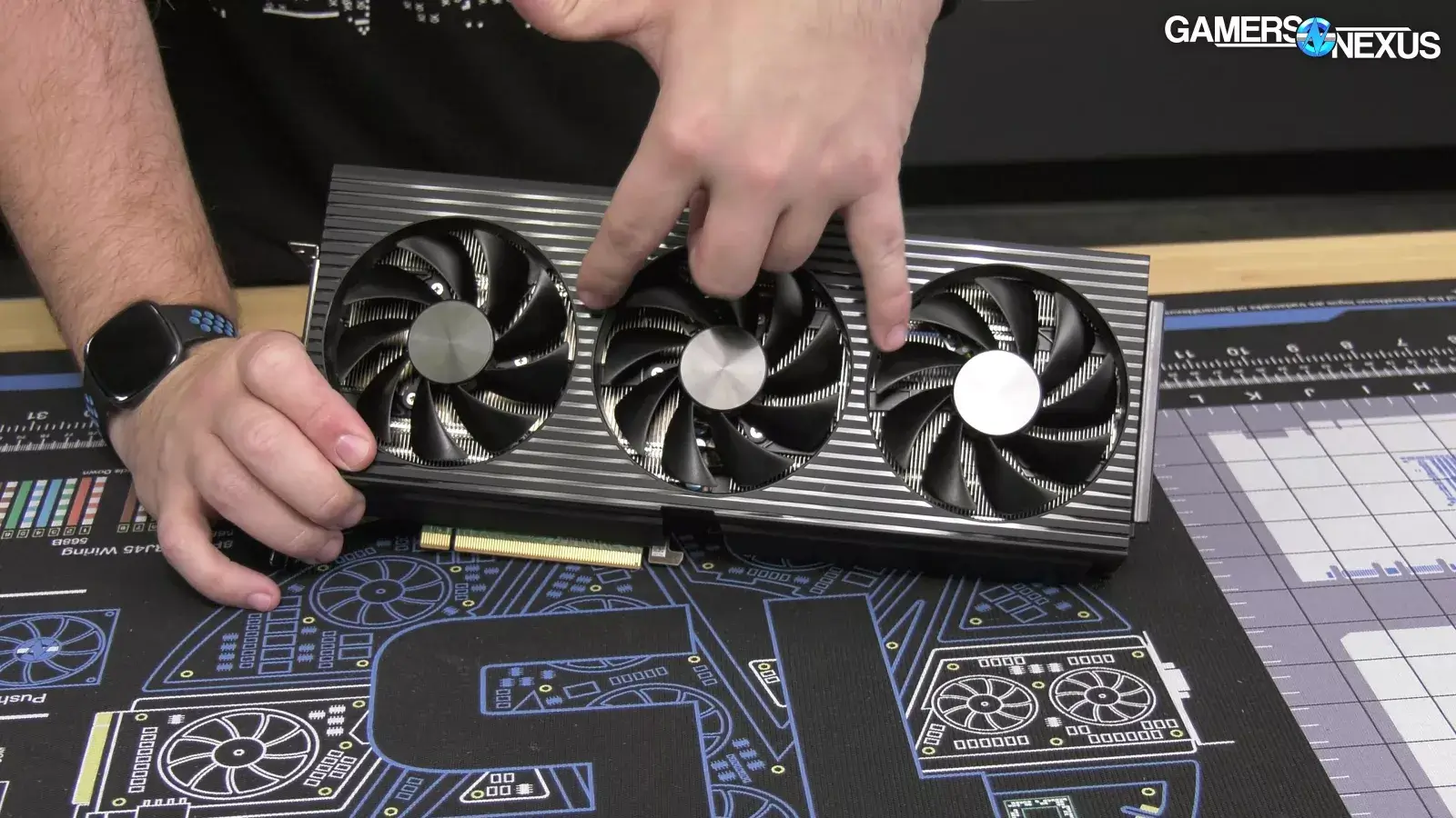 Again, this card came from our Alienware R15, although the same concept would apply to the R16 that we’re working on reviewing now: The card will pull air in through the front intake fan and the lower ventilation in the side panel, then anything passed through the flow-through hole will hit the top exhaust from the CPU cooler. Although this increases the effective ambient of the CPU cooler intake, these larger 240mm liquid coolers are more capable of handling it and the GPU will benefit more than the CPU will lose -- especially given Dell’s clamping-down on power budget.