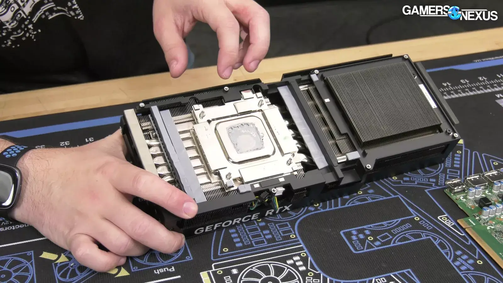 On the PCB, we noticed that there’s room to populate more capacitors, MOSFETs, inductors, and build additional VRM phases. This suggests there is headroom for a more powerful card like a 4090 Ti -- or they just down-costed it. On the GPU itself, we noticed that the thermal paste on it looks spread across in an oddly manual way. Cleaning off the thermal paste reveals the AD102-300-A1 die, which is to be expected for a 4090.
